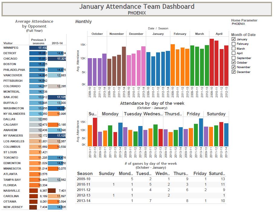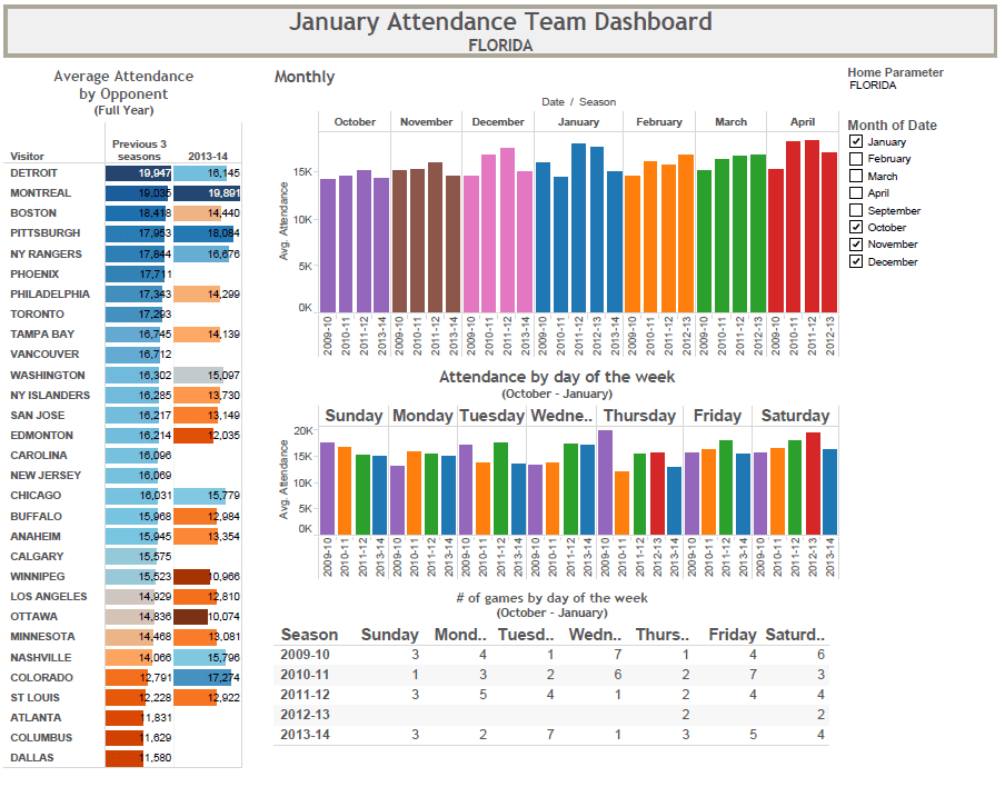 Per reader request, here is Tampa Bay’s Dashboard. The Lightning are flat compared to 2011-12 season but January was a big month up 6% compared to 2012. Also cool to see that they have averaged over 18K in each month this season.